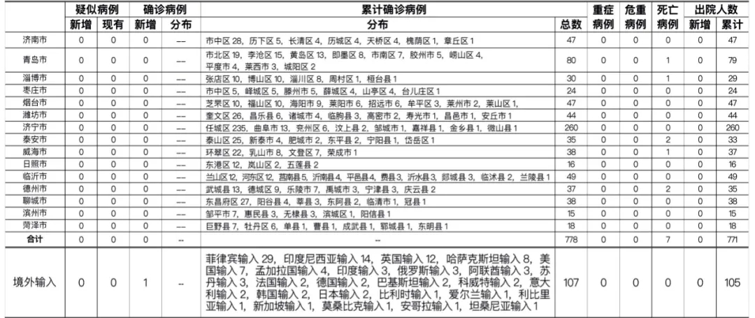 备注:1.山东省本地病例按确诊时医院所在县区统计,境外输入病例单独统计。