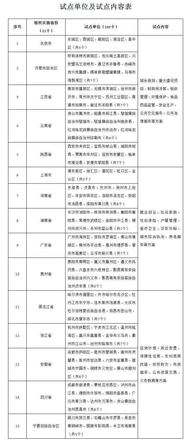 根据各地区实际情况和政务公开工作基础,确定在北京市、安徽省、陕西省等15个省(区、市)的100个县(市、区)(以下称试点单位),重点围绕城乡规划、重大建设项目、公共资源交易、财政预决算、安全生产、税收管理、征地补偿、拆迁安置、保障性住房、农村危房改造、环境保护、公共文化服务、公共法律服务、扶贫救灾、食品药品监管、城市综合执法、就业创业、社会保险、社会救助、养老服务、户籍管理、涉农补贴、义务教育、医疗卫生、市政服务等方面开展试点工作(《试点单位及试点内容表》附后)。承担试点任务的省(区、市)在做好试点工作的同时,可以结合实际适当增加试点内容。