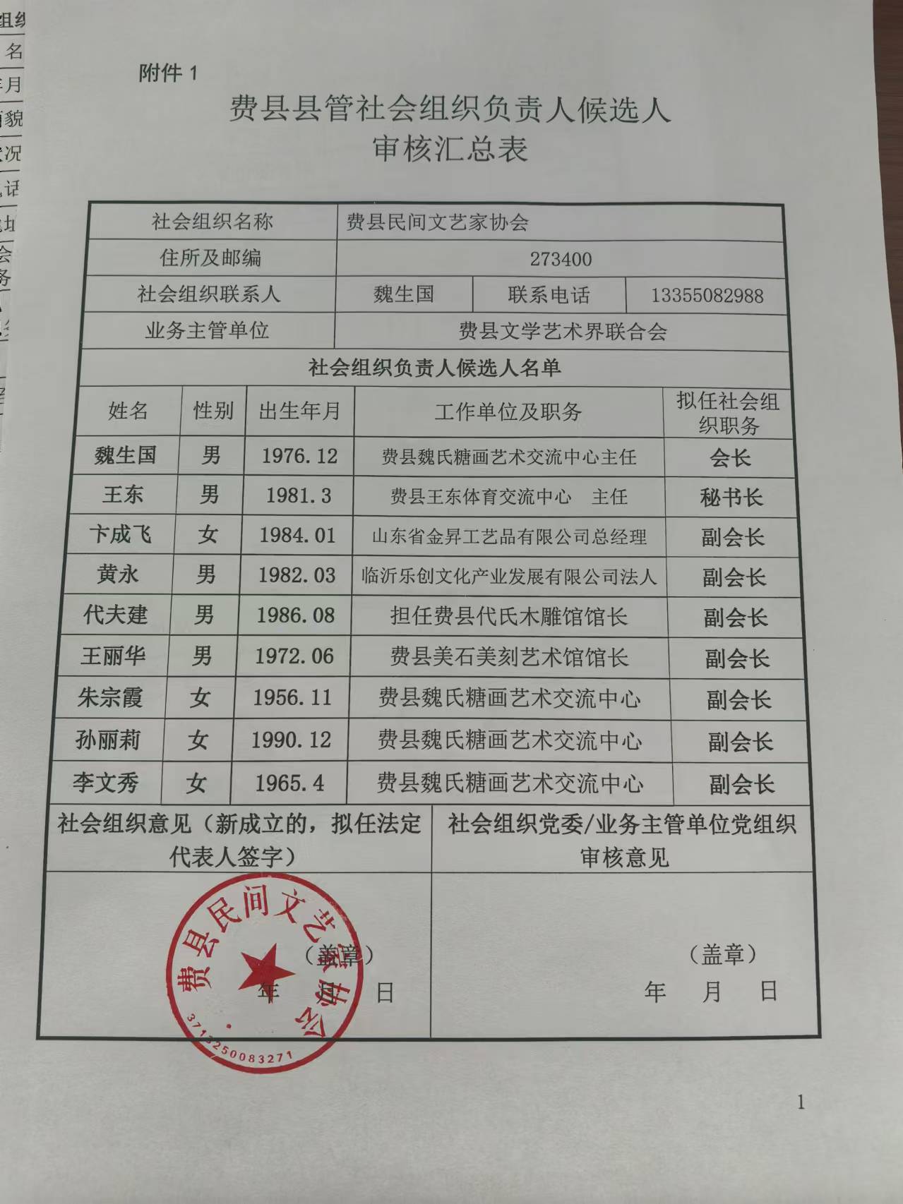 | 费县民间文艺家协会第一届负责人候选人人选公示 | ||||||||||||||||||||||||