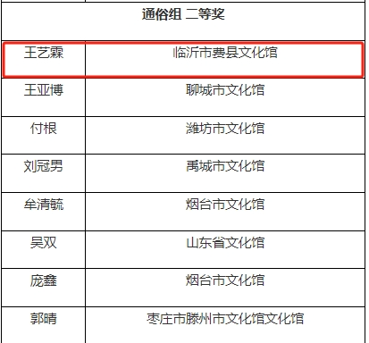 在近日,山东省文化和旅游厅公布了2024年山东省青年歌手大赛获奖名单,费县文化馆王艺霖荣获通俗组二等奖。
