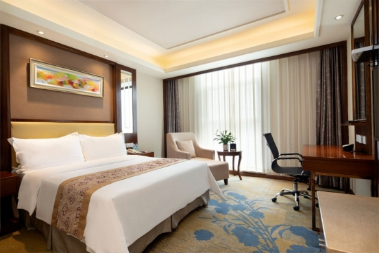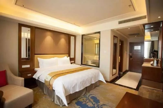 酒店拥有客房205间,多种房型满足不同客源需求,所有客房内设有独立控制的中央空调系统、私人卫生间/淋浴、卫星电视转播频道、小酒吧、国内/国际直拨电话、宽带上网、语音留言信箱及私人电子保险箱,品种丰富的中西式自助早餐满足不同地域的客户需求,贯彻蓝海“您的需求,我的责任”的服务宗旨搭配独有的蓝海会员礼遇,彰显您的身份为您创造一个温馨舒适的住宿环境。 酒店设有3个风格迥异的餐饮区域,可满足不同宴会类型和口味的需求,拥有40个宴会包间,1个自助餐厅,餐位总数达592个(自助餐厅187个餐位,钟鼎楼宴会厅158个餐位,渔歌舫宴会厅200个餐位)。