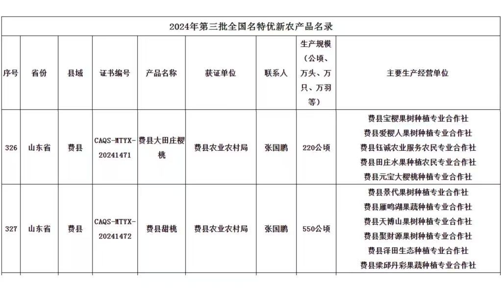 | “费县大田庄樱桃”“费县甜桃”荣获全国名特优新农产品称号 | ||||||||||||||||||||||||