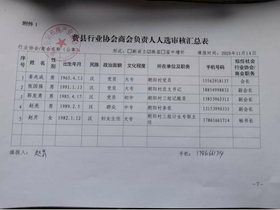 现将费县朝阳核桃协会第二届负责人候选人人选信息进行公示,如有异议,请向费县社会组织党委(设在费县民政局社管办)反映。反映问题要实事求是,对线索不清的匿名电话和匿名信函,不予受理。 公示期限:2025年11月17日至2025年11月21日 受理单位:费县社会组织党委 受理时间:上午8:30—12:00,下午1:30—5:00 联系电话:0539-2113057 通讯地址:费县建设西路487号民政局二楼社会组织管理办公室 邮政编码:273400 费县社会组织党委 2025年11月17日