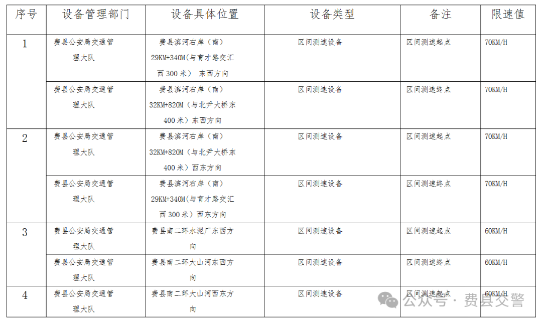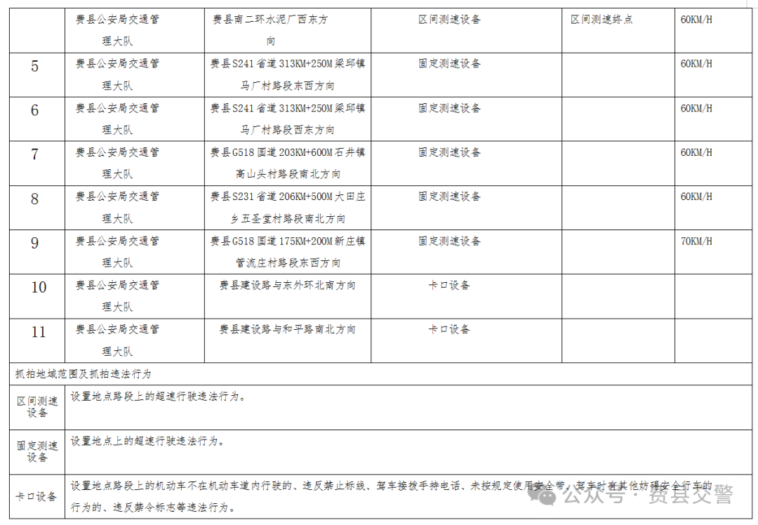 为进一步加强全县道路交通安全管理工作,规范通行秩序、预防道路交通事故,根据《中华人民共和国道路交通安全法》、《中华人民共和国道路交通安全法实施条例》、《山东省实施〈中华人民共和国道路交通安全法〉办法》、《道路交通安全违法行为处理程序规定》等法律、法规规定,费县公安局交通管理大队新增及维修改造11处交通技术监控设备,现对以下设备地点予以公示,自公示之日起5个工作日后,将对有关交通违法行为进行依法管理,请广大交通参与者自觉遵守道路交通法律法规,共同维护良好的道路交通环境。 附件:交通技术监控设备公示统计表 费县公安局交通管理大队 2026年1月30日 新增及维修改造交通技术监控设备公示统计表