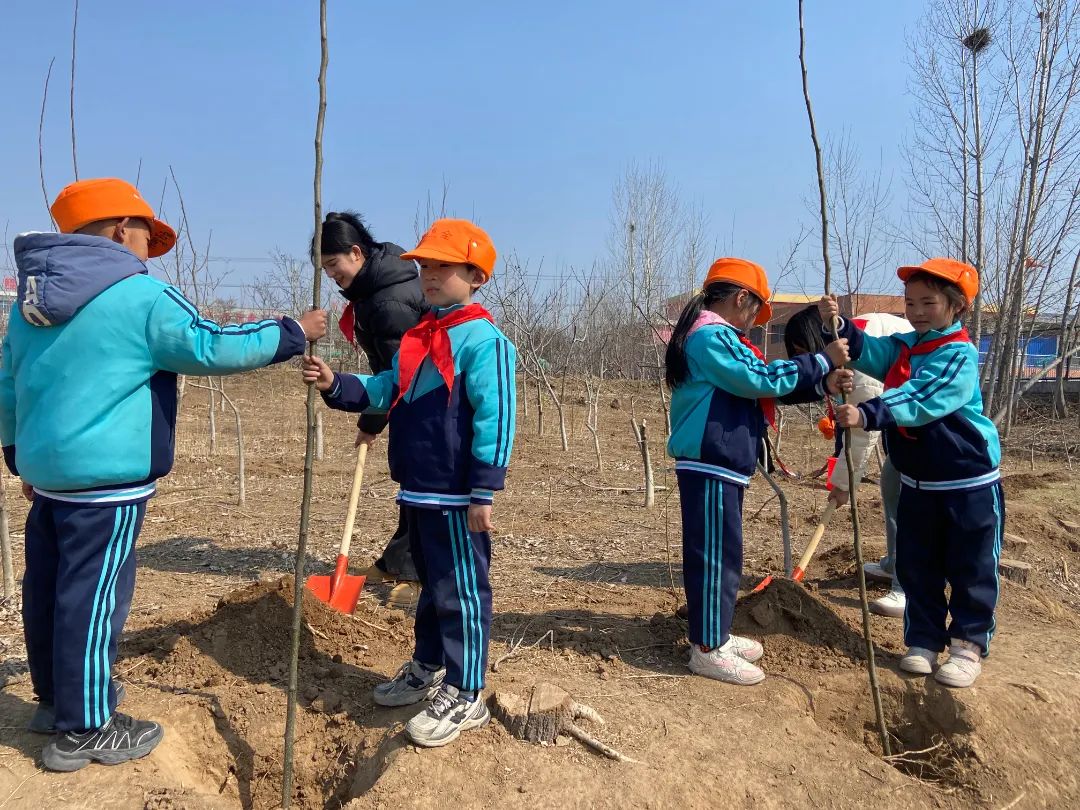 为增强少先队员的环保理念,提高爱绿护绿、保护生态环境的意识,3月12日,胡阳镇徕庄完小组织开展植树节主题实践活动。 活动现场,同学们拿着铁锹、水桶等劳动工具,扛起树苗,挥动锄头挖坑,干劲十足,兴奋不已,稚嫩的小手不停地忙碌着,挖坑、扶苗、填土、浇水……大家相互协作,分工明确,有条不紊,沐浴着和煦的春光,一派热火朝天的劳动景象,成为这个春天的一道美丽风景。