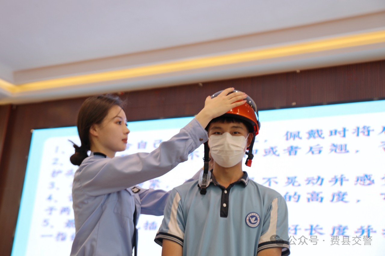 宣讲队员向同学们讲解如何正确佩戴头盔。 活动中, 宣讲队员结合学生们的出行特点精心制作了PPT,采用通俗易懂的语言,对如何正确过马路、安全骑车、安全乘车和如何辩识交通信号、标志标线、“一盔一带”等各个方面为学生们进行了具体、生动的讲解,让学生们认识到交通安全知识的重要性,了解参与交通的常见安全危险,教会学生们发生事故后如何开展自救和求助。