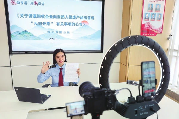 今日,国家税务总局费县税务局组织青年税务干部开展资源回收企业“反向开票”政策直播答疑活动,对“反向开票”政策内容、操作流程等热点问题进行讲解。