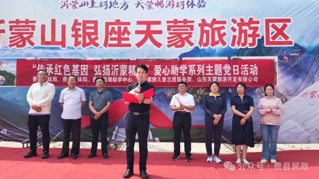 为传承沂蒙红色革命精神,增强孤困儿童的身体素质和意志力,助力孤困儿童健康成长,5月19日,费县在大青山党性教育基地和沂蒙山银座天蒙旅游区举办“传承红色基因弘扬沂蒙精神”爱心助学活动。县民政局党组书记、局长、四级调研员陈明海、山东天蒙旅游开发有限公司常务总经理、支部书记万世杰出席活动并致辞。县民政局、县教体局、县融媒体中心、县关工委孤困儿童心理辅导志愿服务团、益海嘉里集团及益海助学中心分管领导及师生100余人参加活动。