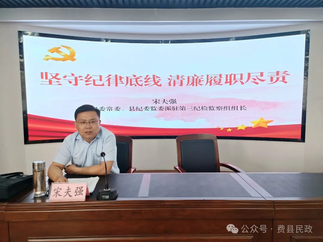 为深入学习贯彻习近平总书记关于党纪学习教育的重要指示精神,认真落实中央、省市县委关于开展党纪学习教育的部署要求,以案示警、以案为鉴、以案明纪、以案促改,推动党纪学习教育走深走实、见行见效。6月7日,费县民政局召开全县民政系统党风廉政建设暨警示教育大会,县纪委常委、县纪委监委派驻第三纪检监察组组长宋夫强同志到会指导,县民政局党组书记、局长、四级调研员陈明海同志主持会议,全体干部职工参会。