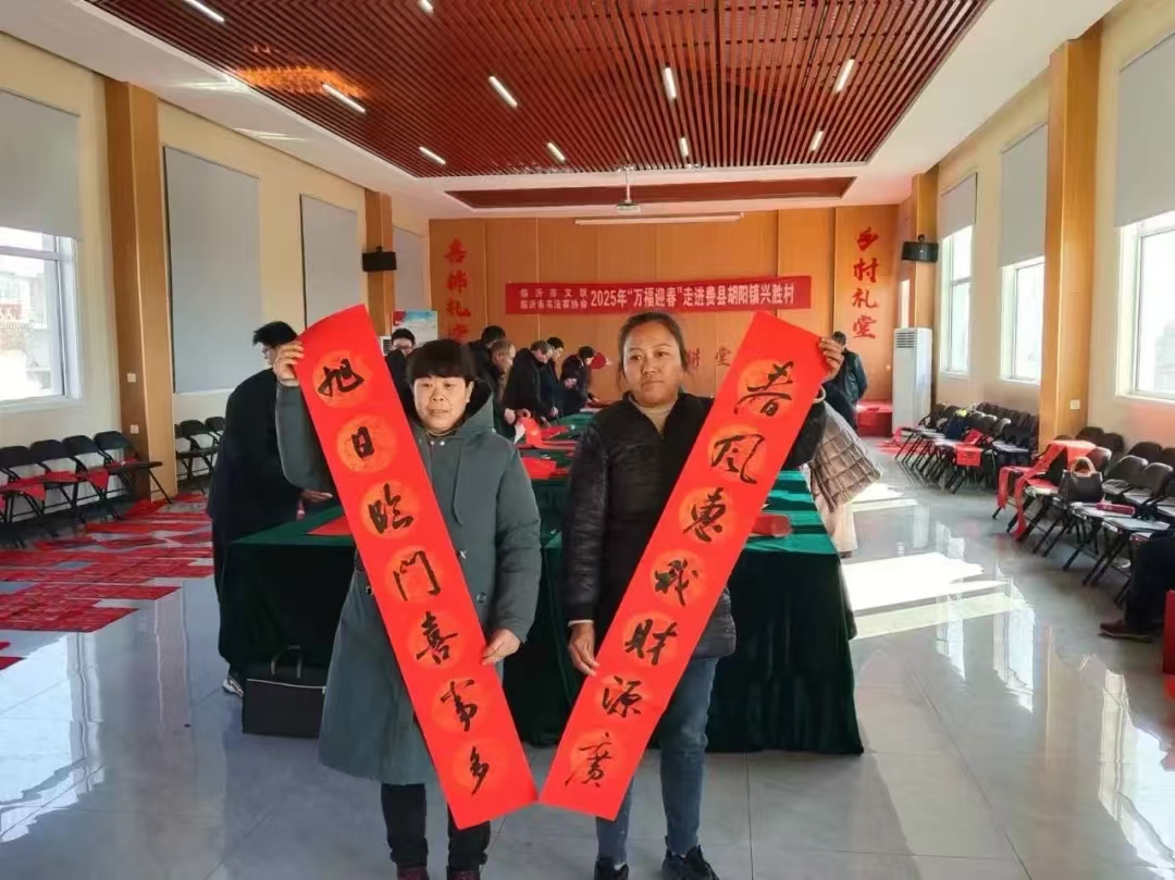 春节临近,年味渐浓。为进一步丰富广大村民的精神文化生活,营造浓厚文化氛围,1 月 15 日,“万福迎春”第十四届山东省文联新时代文明实践“百县千村”书法惠民活动——临沂市书法家协会走进费县胡阳镇兴胜村。 活动现场,人潮涌动,热闹非凡。老师们挥毫泼墨,写下一幅幅满载祝福的春联,一张张承载希望的“福”字,一笔一画遒劲有力,一字一句增添吉祥瑞气,寄托着人们对新年美好生活的憧憬与希望。