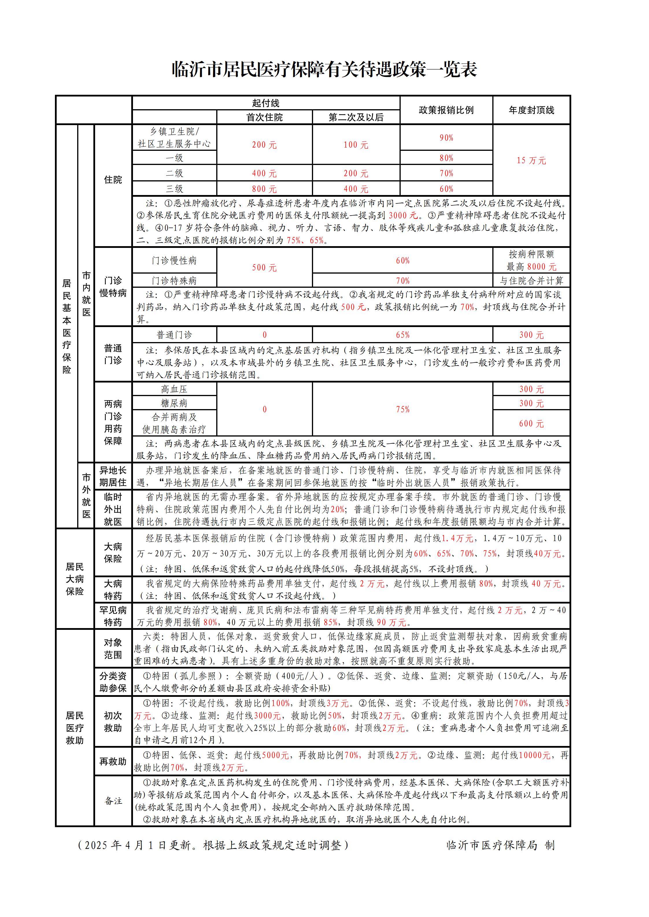 临沂市居民医疗保障有关待遇政策一览表