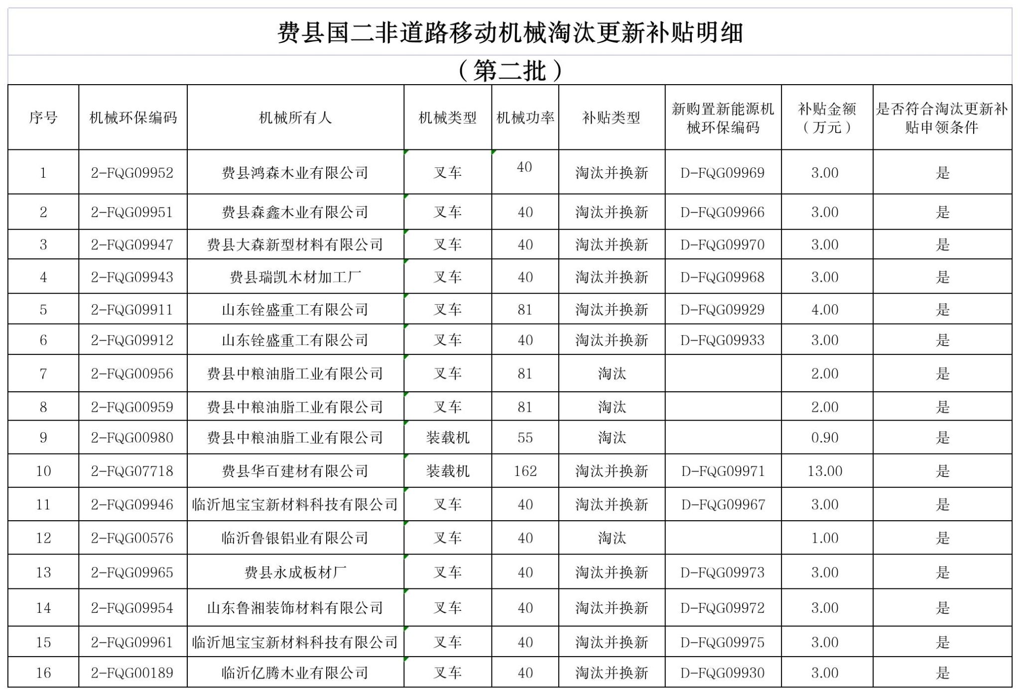 | 关于费县国二排放标准非道路移动机械淘汰及新能源替代(第二批)的公示 | ||||||||||||||||||||||||