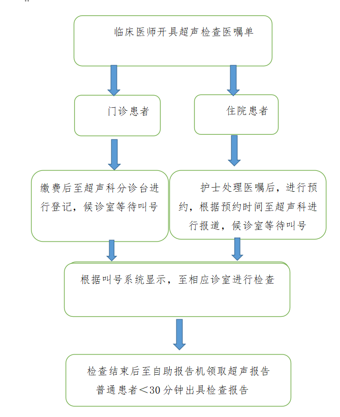 二、超声检查相关事宜 (一)超声诊断科专业服务及介绍 1.超声诊断科:临沂市临床重点专科,科室拥有专业技术人员23名,配有飞利浦Q7高档全身彩色超声诊断仪、GE VolusonE10高档妇产彩色超声诊断仪、西门子SC2000高档心脏专用彩色超声诊断仪、GE LOGIO E9超声诊断仪、GE VolusonE8彩色超声诊断仪、日立850超声诊断仪、日立A70超声诊断仪等先进仪器设备。 2.超声科日常工作涵盖有:腹部超声,例如:肝脏、胆囊、胰腺、脾脏、双肾、肾动脉、肾上腺、膀胱、前列腺等;浅表器官超声,例如:甲状腺、乳腺、睾丸、眼球、淋巴结、腮腺等;心血管超声,例如:心脏超声、腹部血管超声、颈部血管超声、四肢血管超声等;妇产科超声,例如:子宫及附件、产科早中晚孕期检查、经阴道超声、产科大排畸筛查等;关节超声,例如:小儿髋关节检查;床旁超声检查等。与临床各科室合作开展超声介入工作,例如:肾病内科联合超声科开展超声引导下的经皮穿刺肾活检技术;外二科联合超声科开展超声引导下的乳腺结节旋切术、甲状腺结节消融术、胆囊及胆管置管引流、肝脓肿置管引流等;肿瘤内科联合超声科开展超声引导下的肿瘤穿刺活检术、胸腔积液及腹腔积液穿刺引流等。 (二)超声诊断科检查须知及注意事项 1.进行肝、胆、胰、脾、胃超声检查患者需要当日清晨口服,禁食8小时以上。 2.进行泌尿系、子宫附件、早孕期及产科怀疑前置胎盘患者超声检查前需要进行憋尿。 3.进行胎儿大排畸筛查需要提前到科室进行预约。 4.急诊患者到科室进行检查时亦不要直接进入诊室,等待诊室内现有病人结束检查后,优先叫号检查。 (三)超声诊断科检查流程