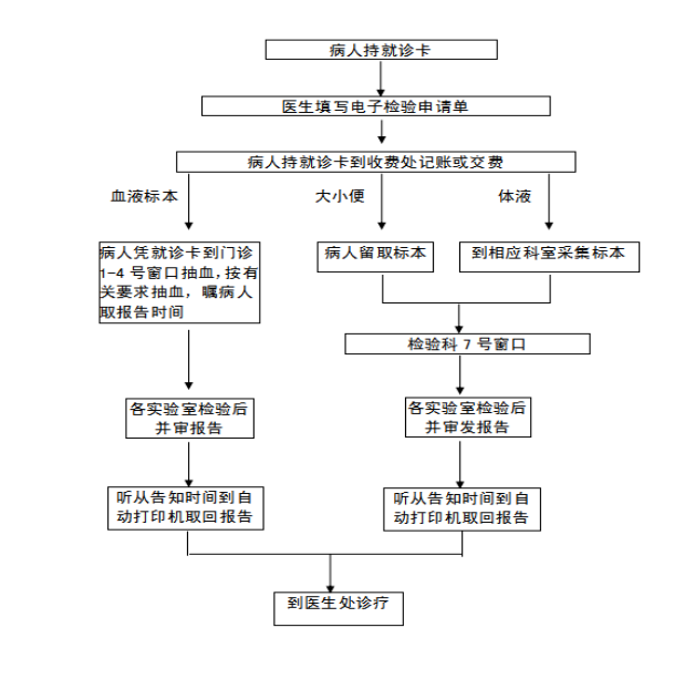 一、检验检查相关事宜 (一)检验科标本接收标准。一是申请单条形码标识清楚,信息清晰,确定是本实验室检验项目的标本。二是病人信息和标本相符合。三是标本量需符合规定要求的,以下为详细说明:1.生化免疫标本才血量最低不少于2ml。2.尿标本不能少于3ml,且无污染。3.出凝血标本(1.7ml-2.3ml),无凝块。4.血液常规标本采血量不能少于1ml,且无凝块。5.大便标本量适中(不能少于1粒黄豆量)且无污染。6.细菌培养采集标本规范《标本采集手册》。四是收集容器必须正确。五是空腹标本必须空腹。六是24小时尿蛋白定量尿量标识准确。七是痰培养低倍镜下镜检鳞状上皮细胞小于25个。 (二)常规检验标本采集须知 1.血液标本采集 (1)检验生化(肝功,肾功,血脂,血糖,生化全套等)免疫(乙肝五项,丙肝等等)等项目时要求抽静脉空腹血。因为餐后血液中诸多成分会发生改变,影响检验结果的准确性。 (2)检验血脂时,要求至少禁食12小时,禁酒72小时。因为饮用乙醇可以造成血脂急性,一过性的升高。 (3)严禁酒后查肝功,因为大量饮酒可导致ALT,GGT等一过性的升高。 2.尿液标本采集 (1)尿液标本采集须新鲜,要求标本留取后30分钟内送检,久置可使尿液内管型,细胞等有形成分溶解以及细菌的繁殖污染。 (2)成年女性应该避开月经期。为防止阴道分泌物混入,应留取中段尿(排去开始部分尿)。 (3)细菌培养时请到细菌室领取消毒容器按照医生的嘱咐留取。 3.粪便标本的留取 (1)将新鲜粪便3-5克(约花生米大)留取在一个不渗透的洁净容器内。 (2)肉眼观察大便不正常时,一定要挑取病变成分如;脓,血,粘液等。 (3)不要混入尿液,消毒剂和污水卫生纸。 (4)标本留取后,应30分钟内送检。 4.精液标本的采集 (1)采集时以手淫法为宜,将一次射出的全部精液收入干净的容器内。 (2)精液收集后立即保温(20-40°C)在1小时内送检。 (3)避免用避孕套当为容器,因为影响精子活力。 (4)最好采集禁欲2-5天后的精液。 (5)避免混入尿液。 (三)门诊病人就诊检验流程