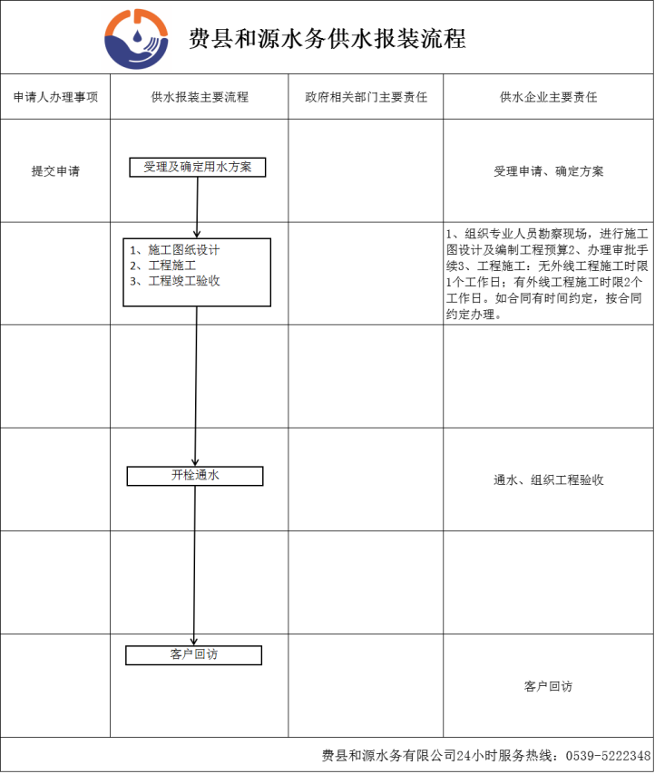 尊敬的客户: 欢迎您来到费县和源水务有限公司办理接水报装业务!请您仔细阅读以下内容,我们将为您提供便捷、高效的服务。 一、供水报装业务适用范围 1、中小微企业、工商业户及企事业单位、个人客户接入供水业务; 2、新建居民住宅供水设施配套建设及接入供水业务; 二、申请事项 1.申请材料: (1)市工程建设项目审批平台推送项目:无 (2)一般工程建设项目:《费县和源水务有限公司客户供水报装申请表》 2.申请方式: (1)前置服务。接到客户咨询或者通过临沂市工程建设项目审批系统和临沂市建设工程数字化多图联审系统获取项目建设信息后,先行开展确定用水方案、图纸设计、工程施工等服务,提前完成外线工程实施,为客户提供“无感免申请”服务。 (2)线上、线下、电话全方位受理。用户可以通过山东政务网站、“爱山东APP”、“爱山东容沂办APP”、公司网站及微信公众号等网络平台提交相关信息,公司服务人员作为“即办件”处理;也可到营业网点现场办理供水报装业务,服务人员现场帮用户填写用水报装申请表;也可电话预约办理,公司服务人员接到电话后主动与用户预约进行上门服务,帮用户填写用水报装申请表,实现用户“零跑腿”和“零材料”。 三、办理流程