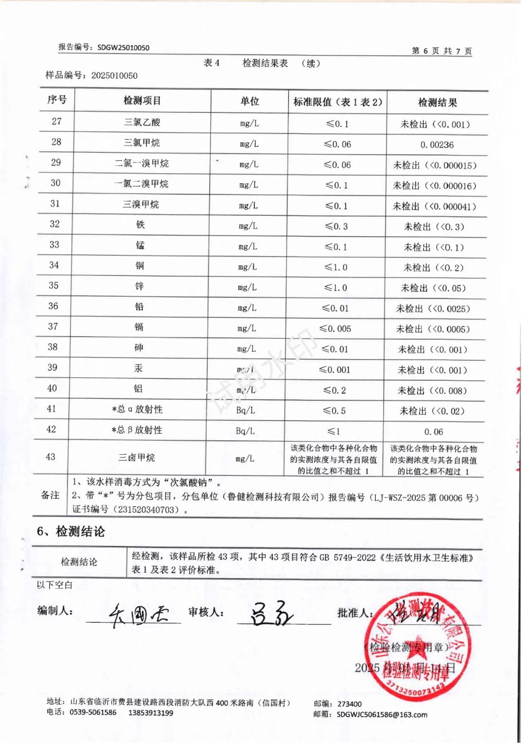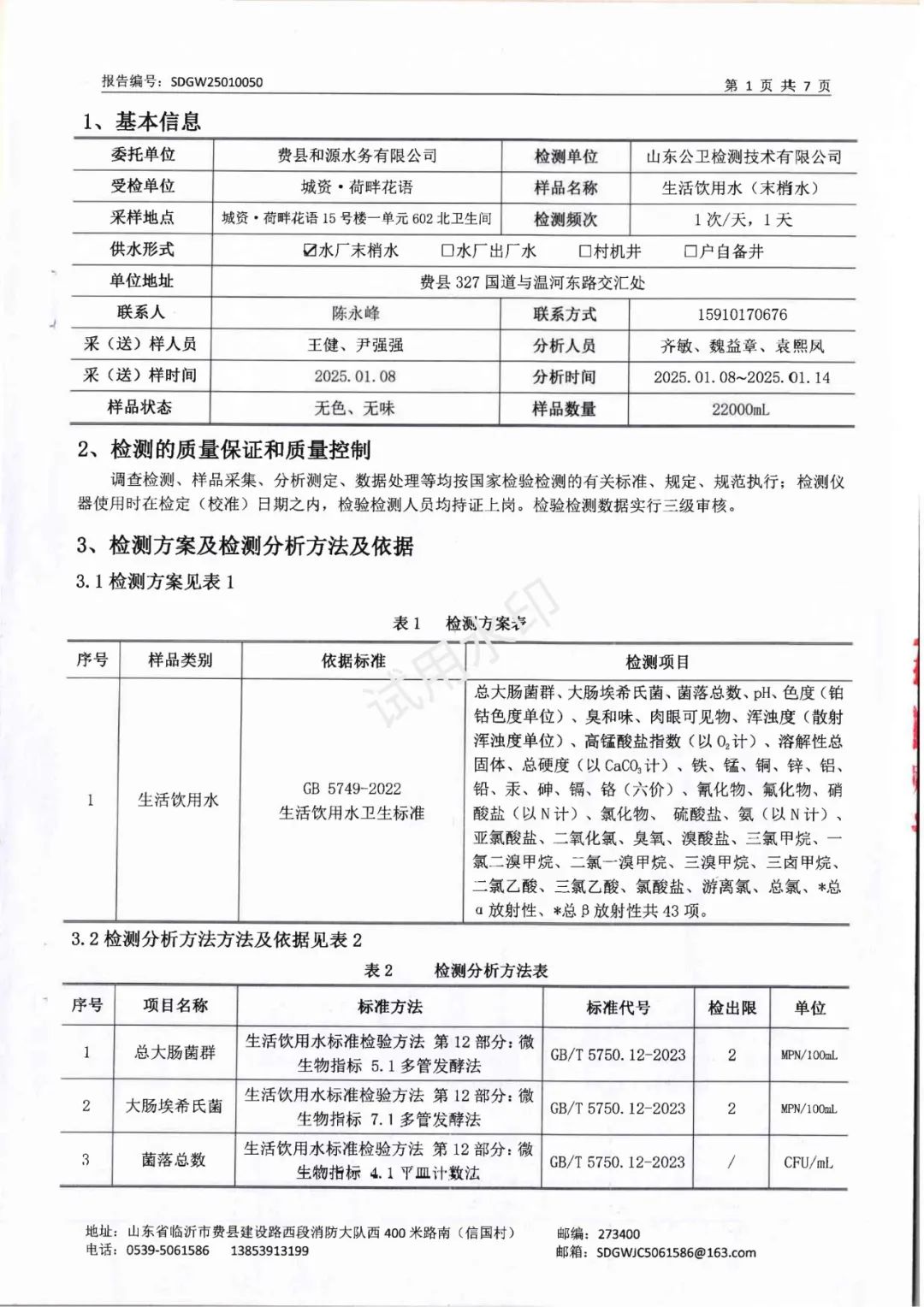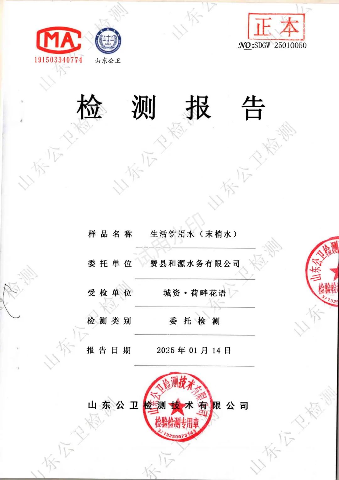 2025年1月水质检测报告(管网末梢水)