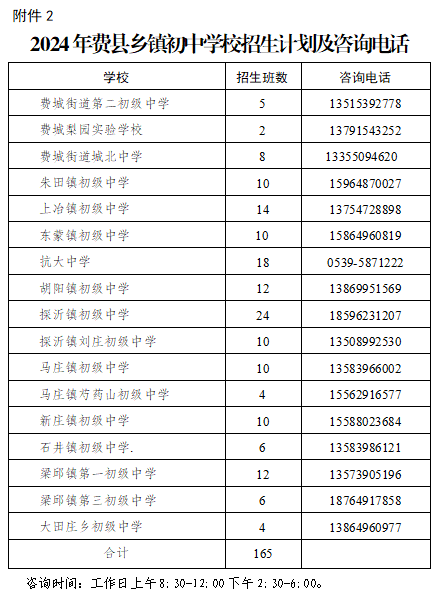 2.2024年费县乡镇初中学校招生计划及咨询电话
