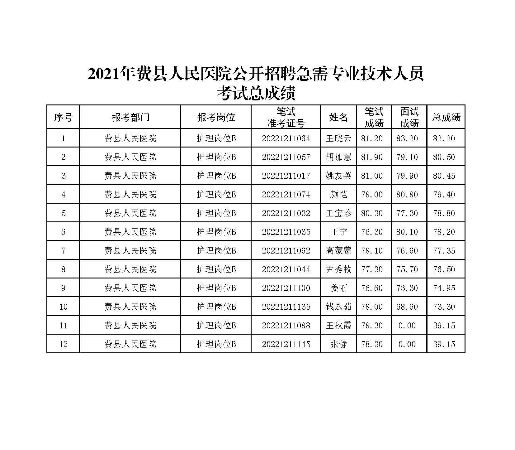附件1:2021年费县人民医院公开招聘急需紧缺专业人员考试总成绩