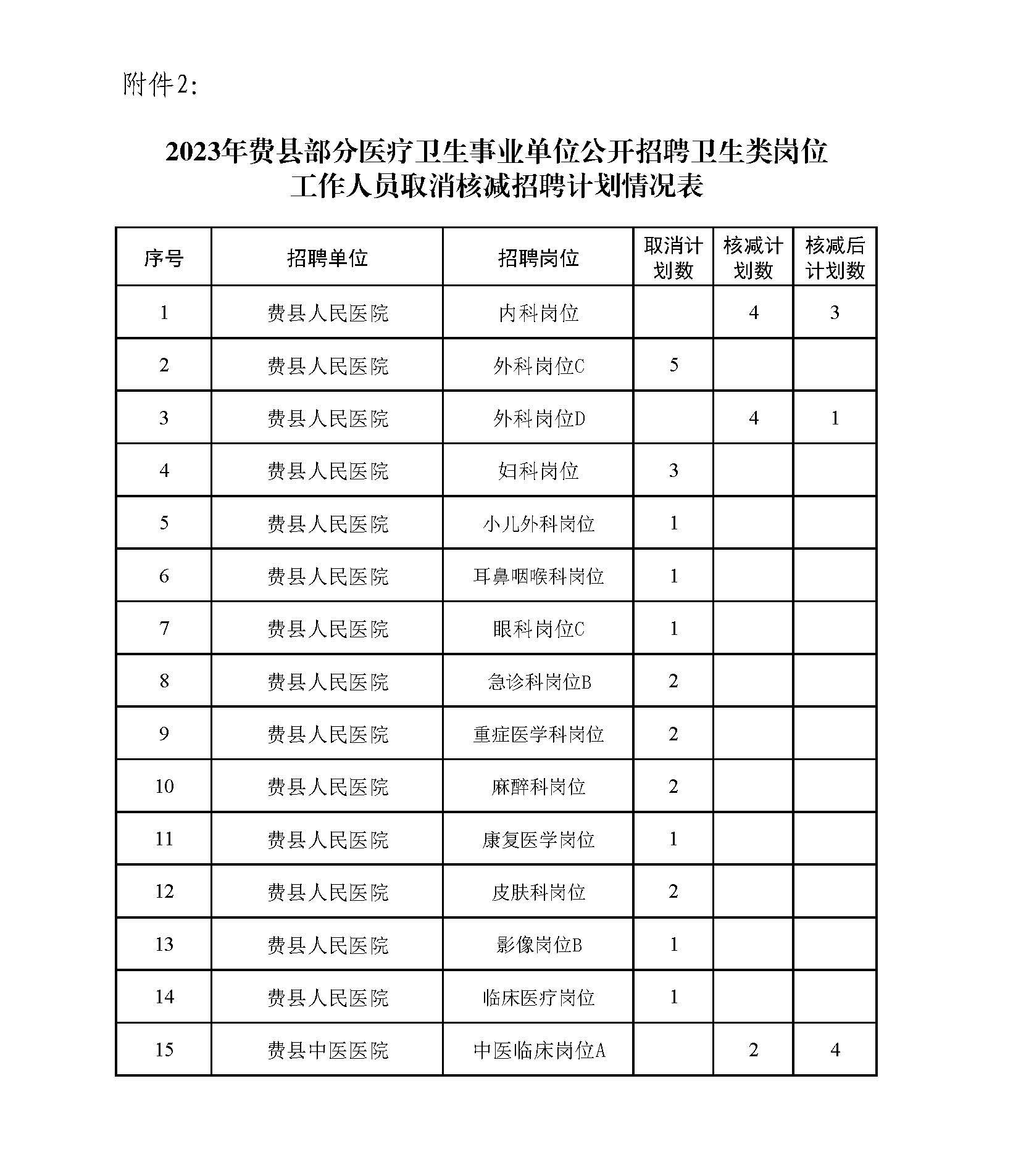 附件2:2023年费县部分医疗卫生事业单位公开招聘卫生类岗位工作人员取消核减招聘计划情况表