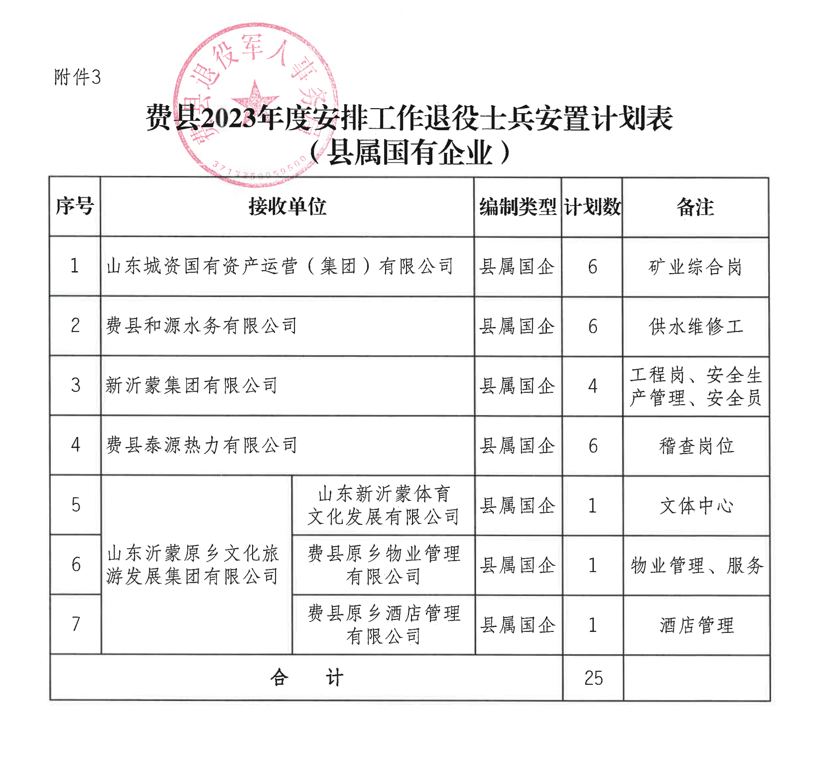 3.费县2023年度安排工作退役士兵安置计划表(县属国有企业)