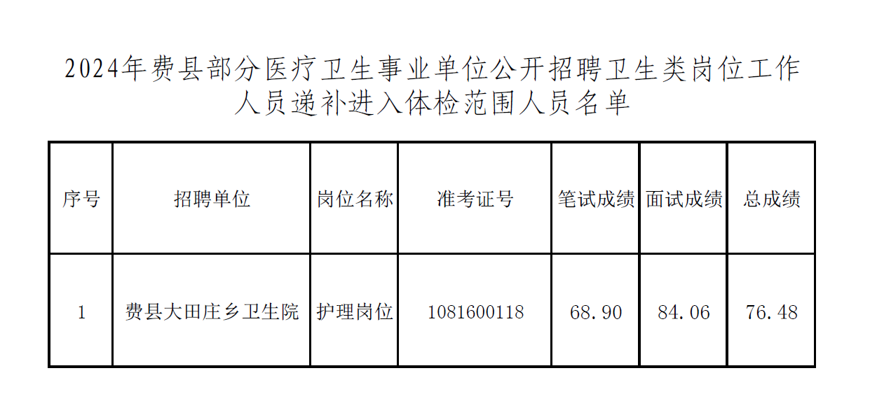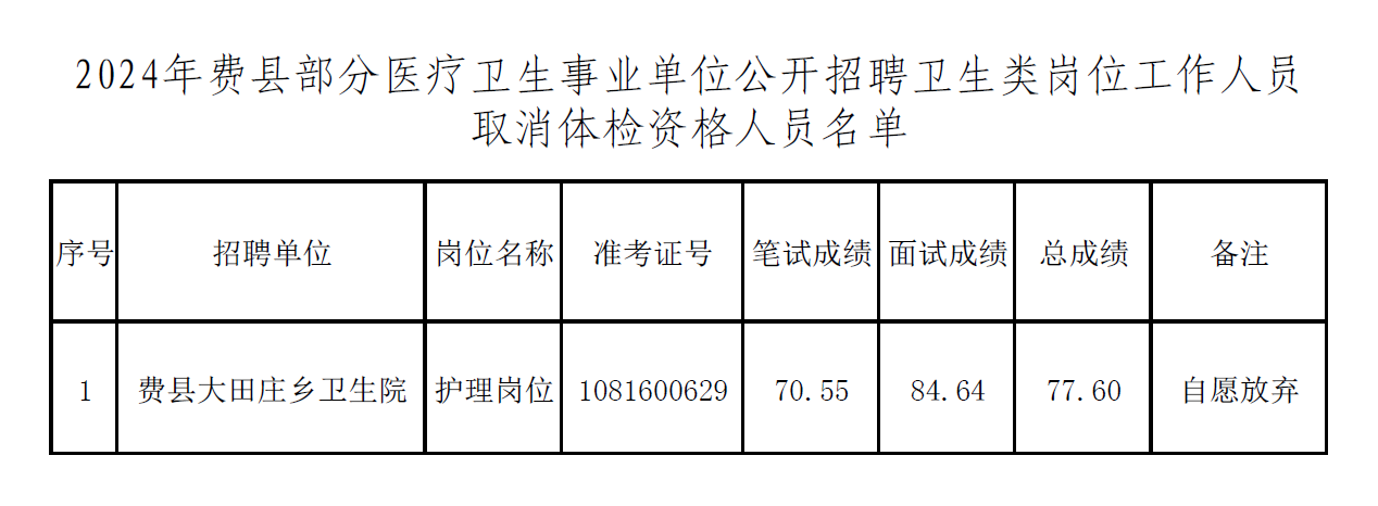 在2024年度费县部分医疗卫生事业单位公开招聘卫生类岗位工作人员体检过程中,有一人因个人原因自愿放弃体检资格,按照《2024年度费县部分医疗卫生事业单位公开招聘卫生类岗位工作人员简章》的有关规定,现将取消体检资格人员名单(附件1)和递补进入体检范围人员名单(附件2)通告如下。