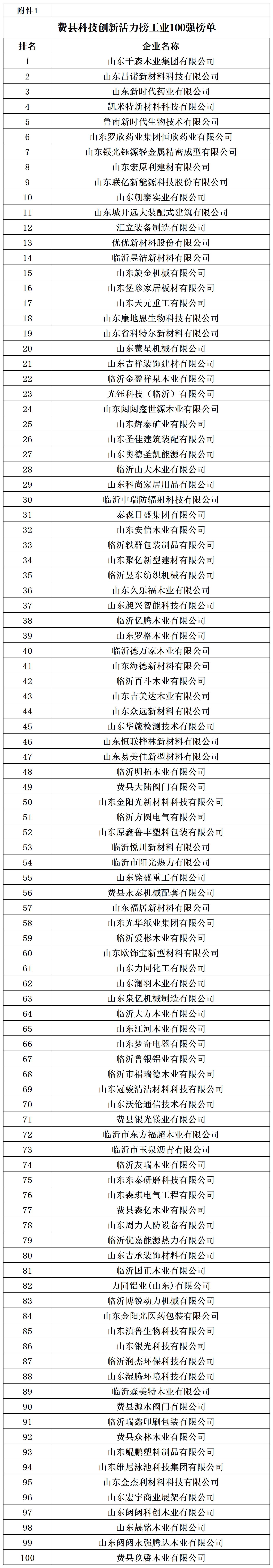 附件:1.费县科技创新活力榜工业100强榜单