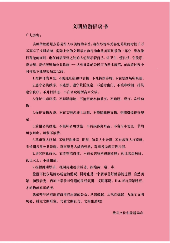 ��费县图书馆 活动一:5月开展“书香费县·全民阅读形象大使评选活动,评选“书香费县·全民阅读”形象大使、“阅读之星”,带动全民阅读; 活动二:全年举办尼山书院·国学经典诵读活动,采用公益读书会的形式,发挥国学经典引领、熏陶、筑基的作用,弘扬优秀传统文化,传承中华美德。 文明旅游倡议书